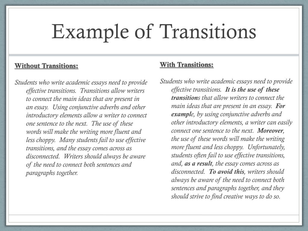 Example of Transitions Without Transitions: Students who write academic essays need to provide effective transitions. Transitions allow writers to connect the main ideas that are present in an essay. Using conjunctive adverbs and other introductory elements allow a writer to connect one sentence to the next. The use of these words will make the writing more fluent and less choppy. Many students fail to use effective transitions, and the essay comes across as disconnected. Writers should always be aware of the need to connect both sentences and paragraphs together. With Transitions: Students who write academic essays need to provide effective transitions. It is the use of these transitions that allow writers to connect the main ideas that are present in an essay. For example, by using conjunctive adverbs and other introductory elements, a writer can easily connect one sentence to the next. Moreover, the use of these words will make the writing more fluent and less choppy. Unfortunately, students often fail to use effective transitions, and, as a result, the essay comes across as disconnected. To avoid this, writers should always be aware of the need to connect both sentences and paragraphs together, and they should strive to find creative ways to do so.