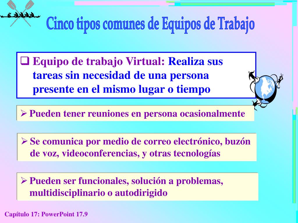 Cinco tipos comunes de Equipos de Trabajo El equipo se administra a sí mismo • Autodirigido: Está conformado por empleados que tienen casi toda la responsabilidad y la autoridad necesaria para trabajar juntos para crear un producto completo o brindar un servicio completo Participa en la selección de nuevos miembros Capacita a los nuevos miembros Evalúa la efectividad del equipo Se comunica con sus clientes Establece sus metas Programa su trabajo Diseña sus procesos de trabajo Escogen un líder (el cual rotarán dentro de los mismos miembros) Capítulo 17: PowerPoint 17.8