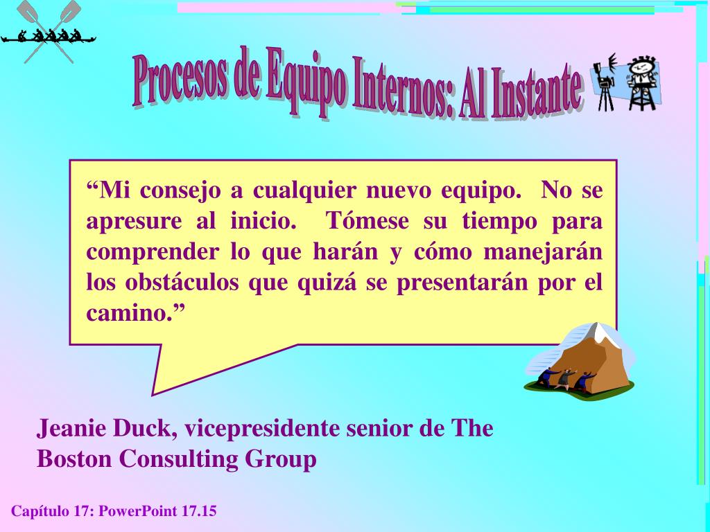 Procesos de Equipo Internos: Al Instante “Mi consejo a cualquier nuevo equipo. No se apresure al inicio. Tómese su tiempo para comprender lo que harán y cómo manejarán los obstáculos que quizá se presentarán por el camino.” Jeanie Duck, vicepresidente senior de The Boston Consulting Group Capítulo 17: PowerPoint 17.15