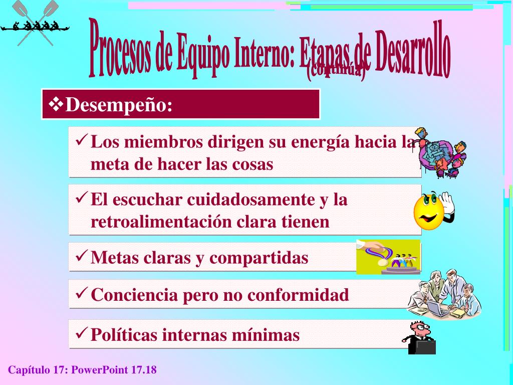Procesos de Equipo Internos: Etapas de Desarrollo • Normas: Los miembros del equipo se van tornando cada vez más positivos respecto al equipo en general, los otros miembros como individuos y lo que está haciendo el equipo • A veces el equipo de trabajo se concentra demasiado en el ¨somos uno¨, la armonía y la conformación • Desempeño: Los miembros suelen confiar en los otros y los aceptan y están concentrados en alcanzar sus metas. • Se fomentas los diversos puntos de vista Capítulo 17: PowerPoint 17.17