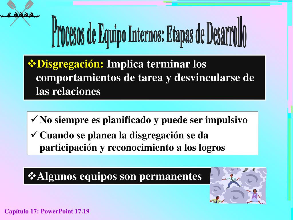 Procesos de Equipo Internos: Etapas de Desarrollo • Disgregación: Implica terminar los comportamientos de tarea y desvincularse de las relaciones • No siempre es planificado y puede ser impulsivo • Cuando se planea la disgregación se da participación y reconocimiento a los logros • Algunos equipos son permanentes Capítulo 17: PowerPoint 17.19