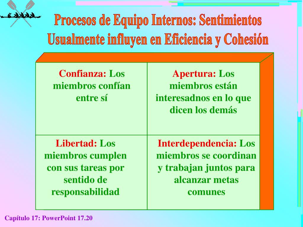 Procesos de Equipo Internos: Sentimientos Usualmente influyen en Eficiencia y Cohesión Confianza: Los miembros confían entre sí Apertura: Los miembros están interesadnos en lo que dicen los demás Libertad: Los miembros cumplen con sus tareas por sentido de responsabilidad Interdependencia: Los miembros se coordinan y trabajan juntos para alcanzar metas comunes Capítulo 17: PowerPoint 17.20