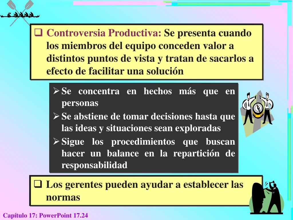 Controversia Productiva: Se presenta cuando los miembros del equipo conceden valor a distintos puntos de vista y tratan de sacarlos a efecto de facilitar una solución • Se concentra en hechos más que en personas • Se abstiene de tomar decisiones hasta que las ideas y situaciones sean exploradas • Sigue los procedimientos que buscan hacer un balance en la repartición de responsabilidad • Los gerentes pueden ayudar a establecer las normas Capítulo 17: PowerPoint 17.24
