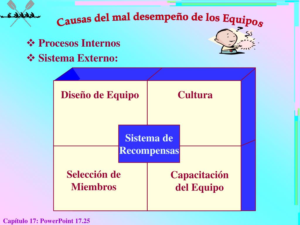Causas del mal desempeño de los Equipos • Procesos Internos • Sistema Externo: Diseño de Equipo Cultura Sistema de Recompensas Selección de Miembros Capacitación del Equipo Capítulo 17: PowerPoint 17.25