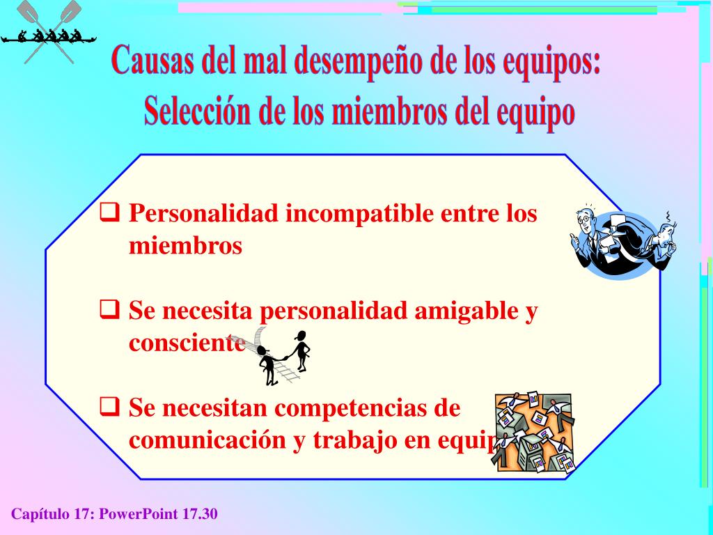 Causas del mal desempeño de los equipos: Selección de los miembros del equipo • Personalidad incompatible entre los miembros • Se necesita personalidad amigable y consciente • Se necesitan competencias de comunicación y trabajo en equipo Capítulo 17: PowerPoint 17.30