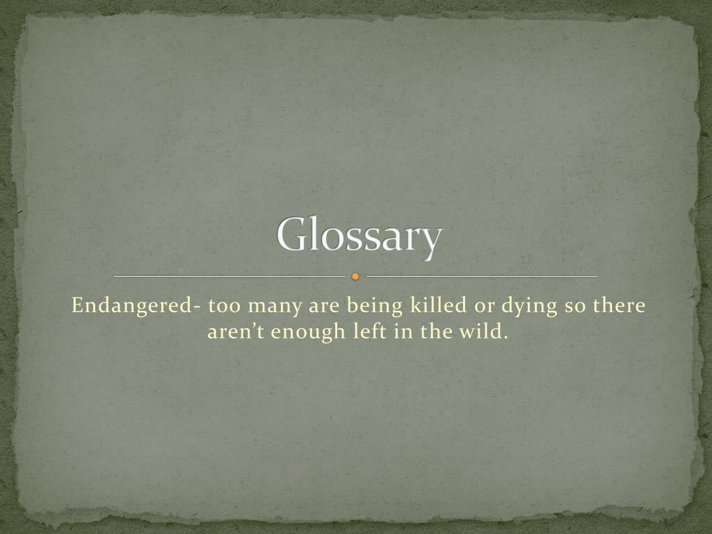Glossary Endangered- too many are being killed or dying so there aren’t enough left in the wild.