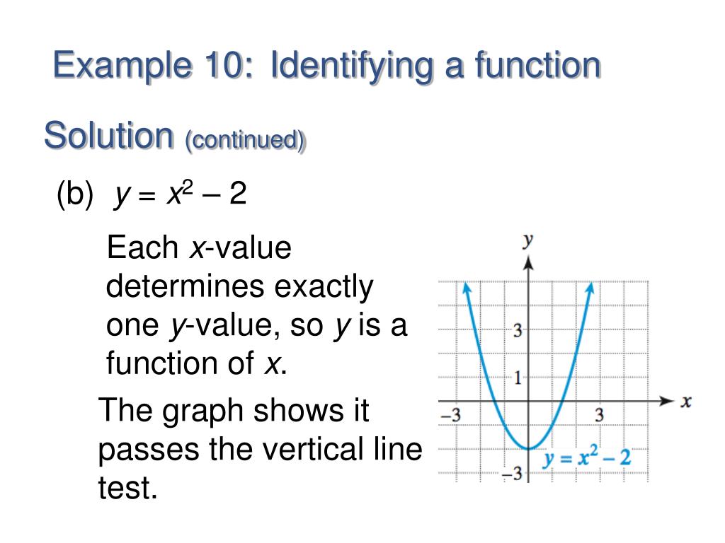 Example 10: Identifying a function Solution (continued) (b) y = x2 – 2 Each x-value determines exactly one y-value, so y is a function of x. The graph shows it passes the vertical line test.