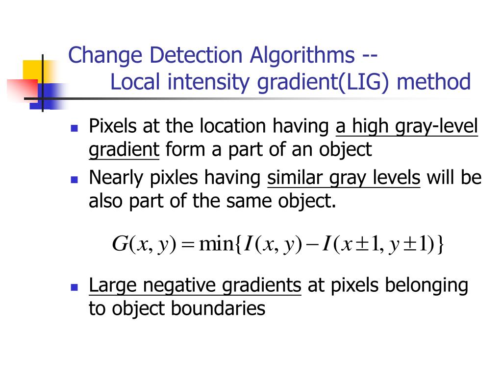 Change Detection Algorithms -- Local intensity gradient(LIG) method • Pixels at the location having a high gray-level gradient form a part of an object • Nearly pixles having similar gray levels will be also part of the same object. • Large negative gradients at pixels belonging to object boundaries