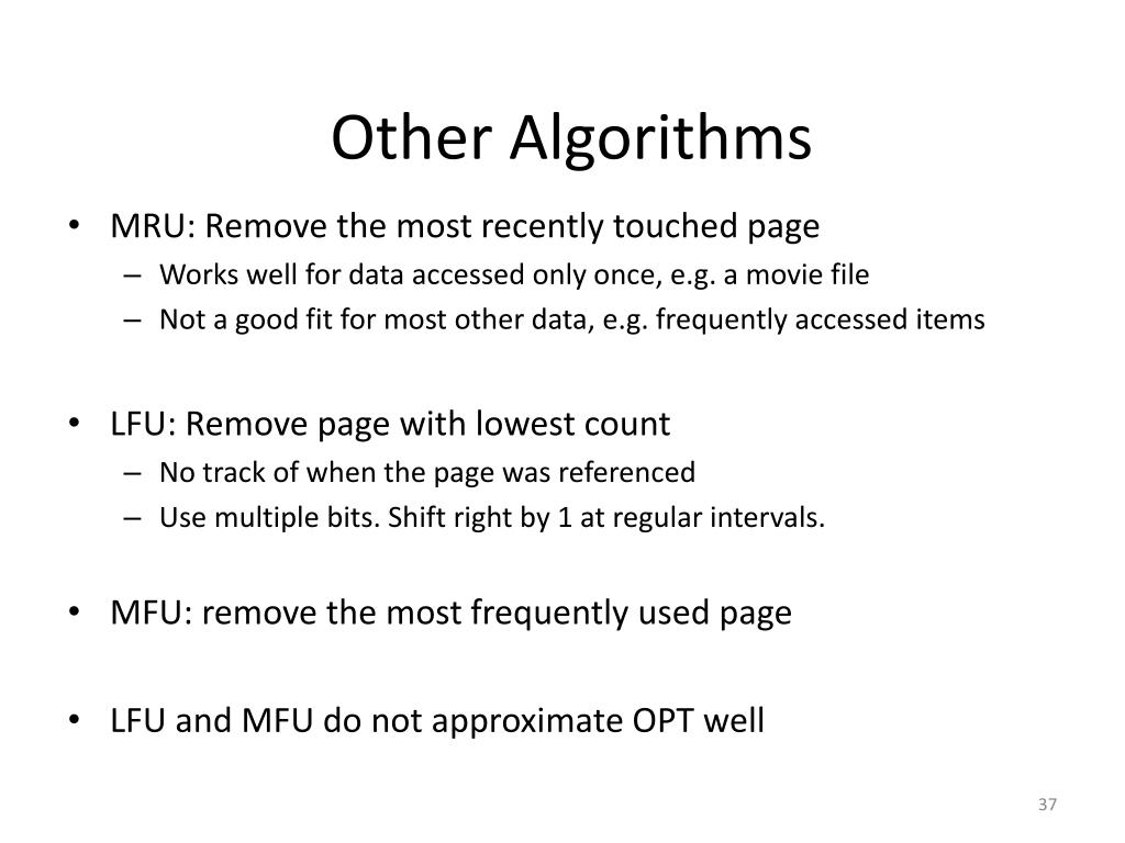 Other Algorithms • MRU: Remove the most recently touched page • Works well for data accessed only once, e.g. a movie file • Not a good fit for most other data, e.g. frequently accessed items • LFU: Remove page with lowest count • No track of when the page was referenced • Use multiple bits. Shift right by 1 at regular intervals. • MFU: remove the most frequently used page • LFU and MFU do not approximate OPT well