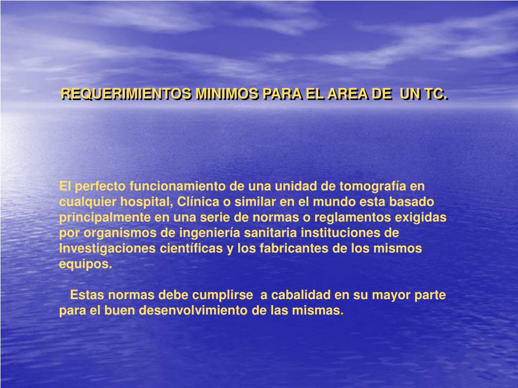 REQUERIMIENTOS MINIMOS PARA EL AREA DE UN TC. El perfecto funcionamiento de una unidad de tomografía en cualquier hospital, Clínica o similar en el mundo esta basado principalmente en una serie de normas o reglamentos exigidas por organismos de ingeniería sanitaria instituciones de Investigaciones científicas y los fabricantes de los mismos equipos. Estas normas debe cumplirse a cabalidad en su mayor parte para el buen desenvolvimiento de las mismas.