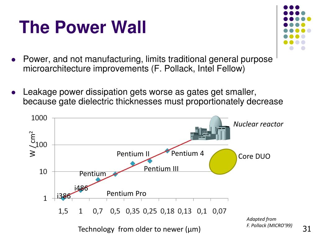 The Power Wall • Power, and not manufacturing, limits traditional general purpose microarchitecture improvements (F. Pollack, Intel Fellow) • Leakage power dissipation gets worse as gates get smaller, because gate dielectric thicknesses must proportionately decrease Nuclear reactor W / cm2 Pentium 4 Pentium II Core DUO Pentium III Pentium i486 Pentium Pro i386 Adapted from F. Pollack (MICRO’99) 31 Technology from older to newer (μm)