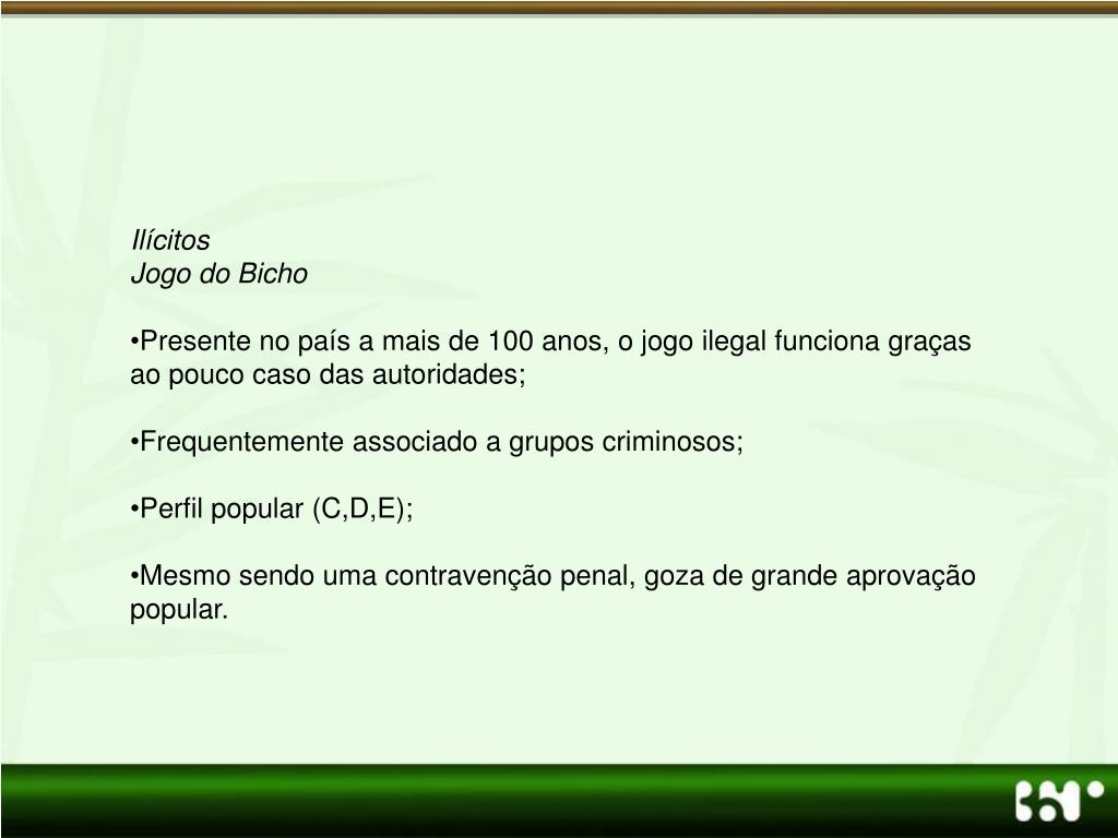 Ilícitos • Jogo do Bicho • Presente no país a mais de 100 anos, o jogo ilegal funciona graças ao pouco caso das autoridades; • Frequentemente associado a grupos criminosos; • Perfil popular (C,D,E); • Mesmo sendo uma contravenção penal, goza de grande aprovação popular.
