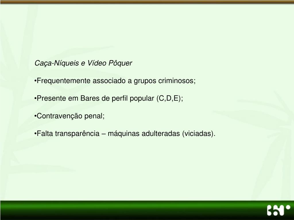 Caça-Níqueis e Vídeo Pôquer • Frequentemente associado a grupos criminosos; • Presente em Bares de perfil popular (C,D,E); • Contravenção penal; • Falta transparência – máquinas adulteradas (viciadas).