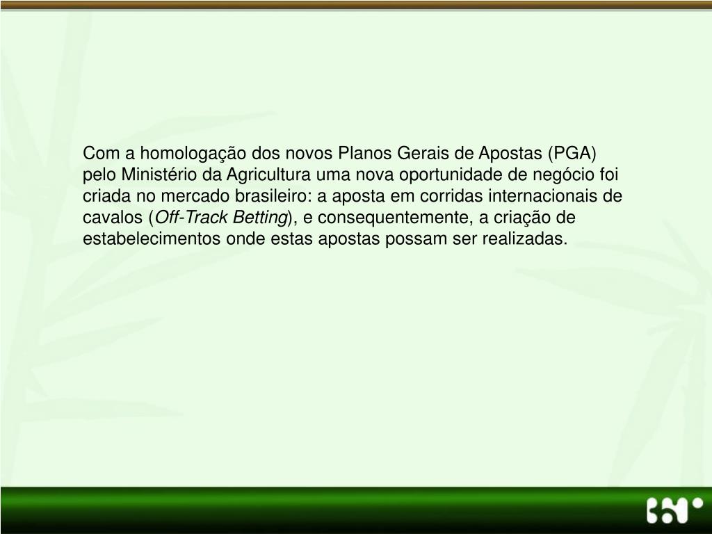 Com a homologação dos novos Planos Gerais de Apostas (PGA) pelo Ministério da Agricultura uma nova oportunidade de negócio foi criada no mercado brasileiro: a aposta em corridas internacionais de cavalos (Off-Track Betting), e consequentemente, a criação de estabelecimentos onde estas apostas possam ser realizadas.