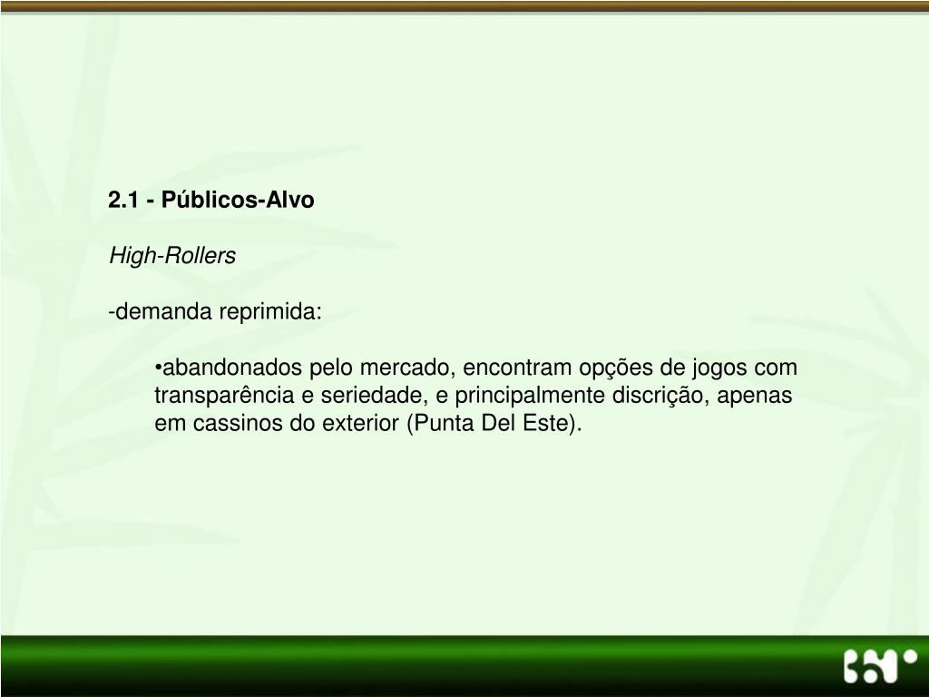 2.1 - Públicos-Alvo • High-Rollers • demanda reprimida: • abandonados pelo mercado, encontram opções de jogos com transparência e seriedade, e principalmente discrição, apenas em cassinos do exterior (Punta Del Este).