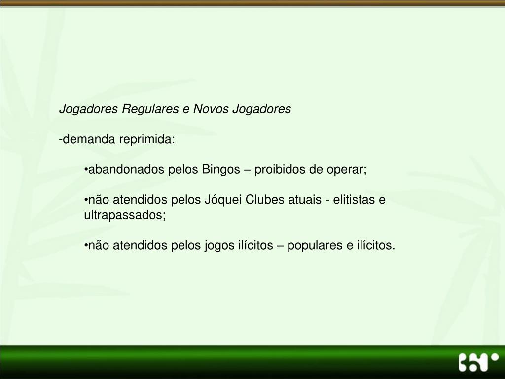 Jogadores Regulares e Novos Jogadores • demanda reprimida: • abandonados pelos Bingos – proibidos de operar; • não atendidos pelos Jóquei Clubes atuais - elitistas e ultrapassados; • não atendidos pelos jogos ilícitos – populares e ilícitos.