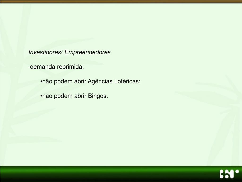 Investidores/ Empreendedores • demanda reprimida: • não podem abrir Agências Lotéricas; • não podem abrir Bingos.