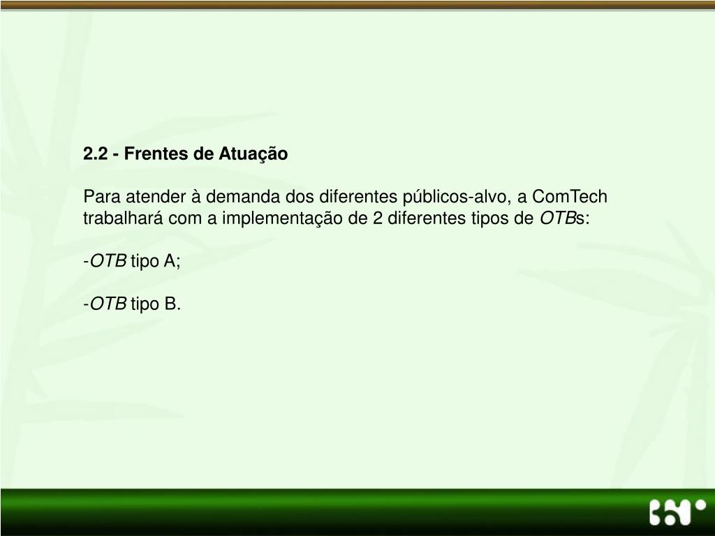 2.2 - Frentes de Atuação • Para atender à demanda dos diferentes públicos-alvo, a ComTech trabalhará com a implementação de 2 diferentes tipos de OTBs: • OTB tipo A; • OTB tipo B.