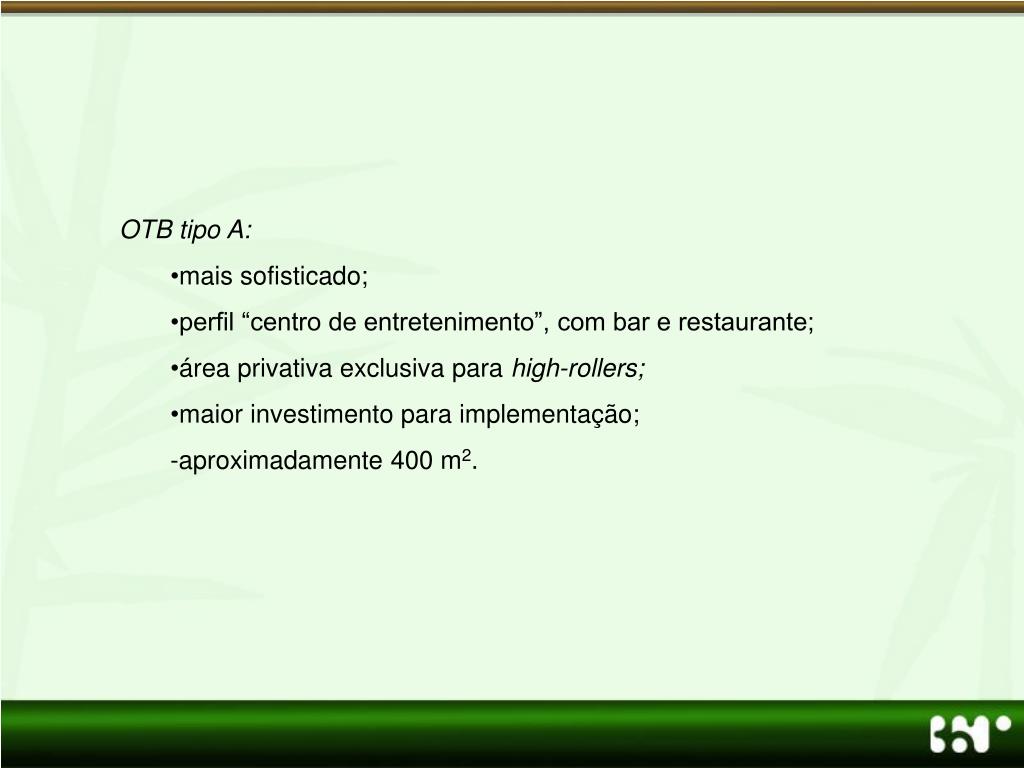 OTB tipo A: • mais sofisticado; • perfil “centro de entretenimento”, com bar e restaurante; • área privativa exclusiva para high-rollers; • maior investimento para implementação; • aproximadamente 400 m2.