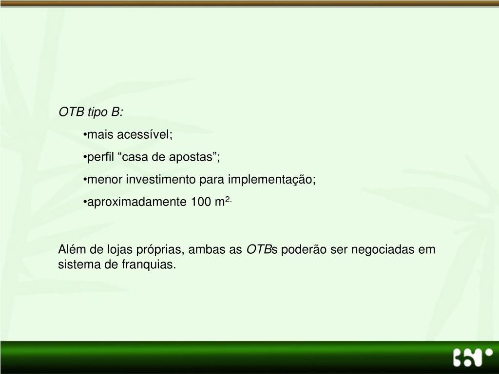 OTB tipo B: • mais acessível; • perfil “casa de apostas”; • menor investimento para implementação; • aproximadamente 100 m2. • Além de lojas próprias, ambas as OTBs poderão ser negociadas em sistema de franquias.