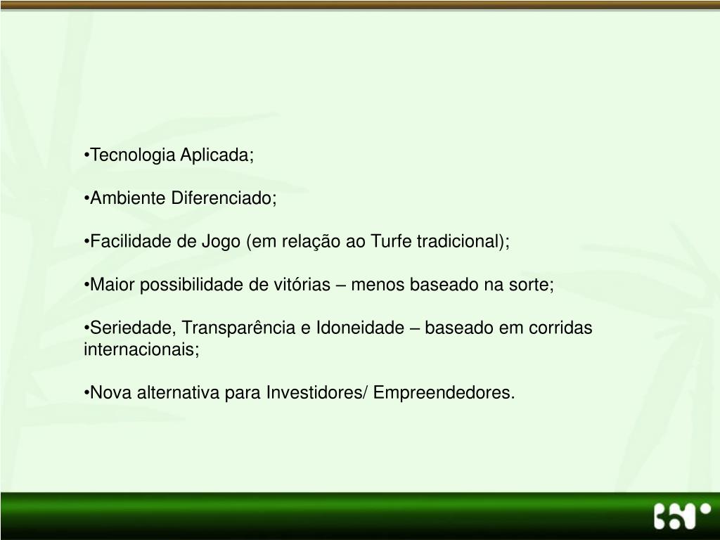 Tecnologia Aplicada; • Ambiente Diferenciado; • Facilidade de Jogo (em relação ao Turfe tradicional); • Maior possibilidade de vitórias – menos baseado na sorte; • Seriedade, Transparência e Idoneidade – baseado em corridas internacionais; • Nova alternativa para Investidores/ Empreendedores.