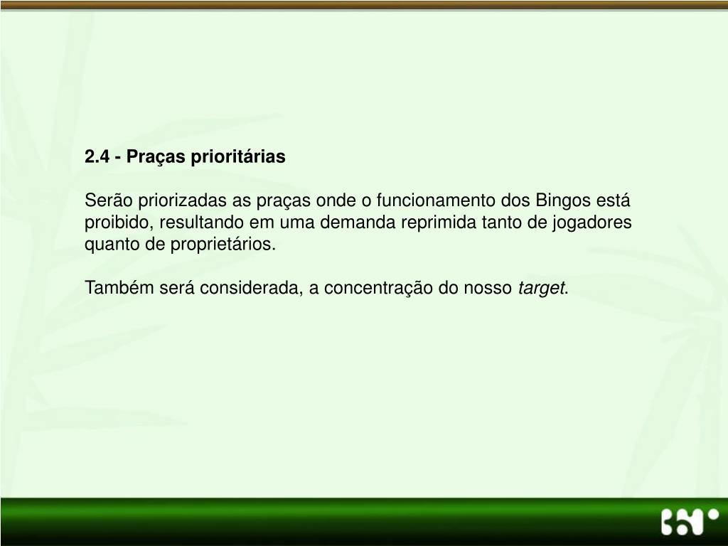 2.4 - Praças prioritárias Serão priorizadas as praças onde o funcionamento dos Bingos está proibido, resultando em uma demanda reprimida tanto de jogadores quanto de proprietários. Também será considerada, a concentração do nosso target.