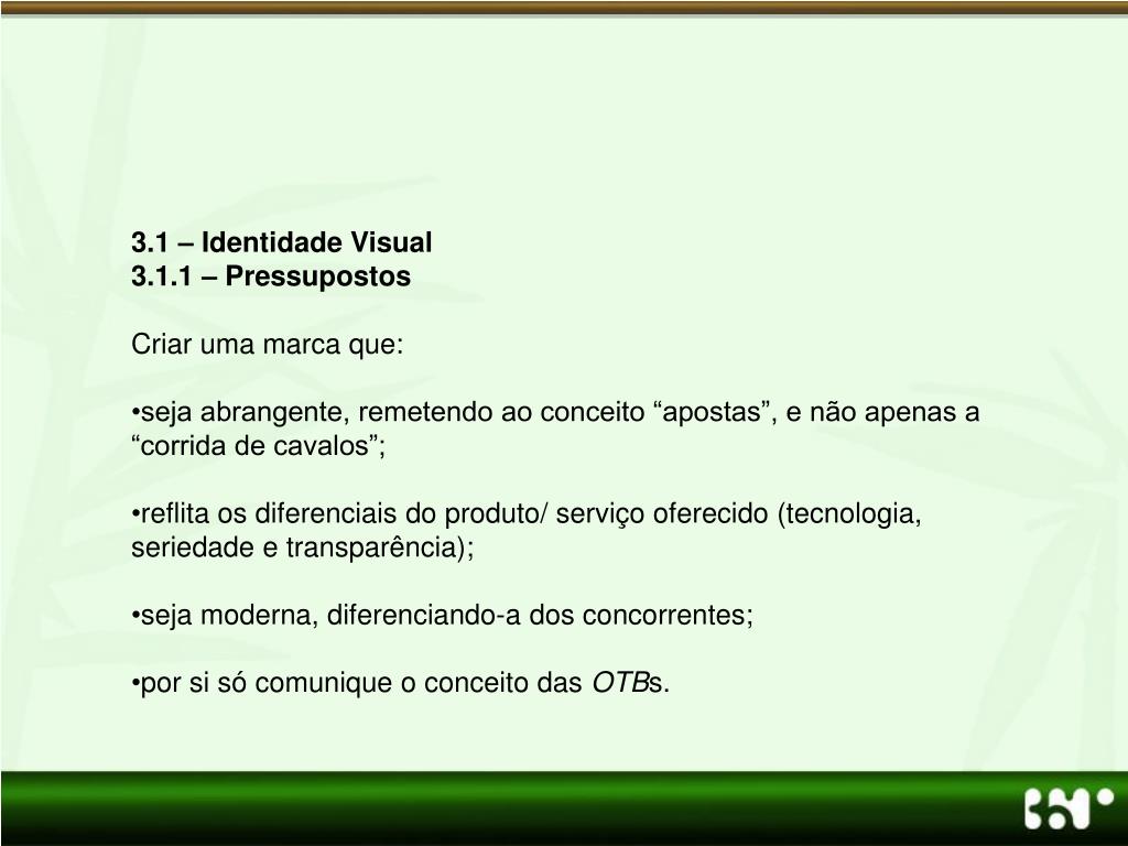 3.1 – Identidade Visual • 3.1.1 – Pressupostos • Criar uma marca que: • seja abrangente, remetendo ao conceito “apostas”, e não apenas a “corrida de cavalos”; • reflita os diferenciais do produto/ serviço oferecido (tecnologia, seriedade e transparência); • seja moderna, diferenciando-a dos concorrentes; • por si só comunique o conceito das OTBs.