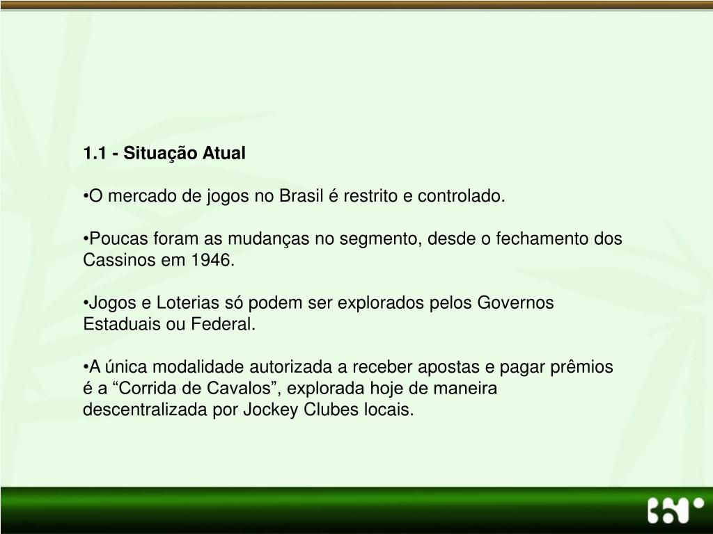 1.1 - Situação Atual • O mercado de jogos no Brasil é restrito e controlado. • Poucas foram as mudanças no segmento, desde o fechamento dos Cassinos em 1946. • Jogos e Loterias só podem ser explorados pelos Governos Estaduais ou Federal. • A única modalidade autorizada a receber apostas e pagar prêmios é a “Corrida de Cavalos”, explorada hoje de maneira descentralizada por Jockey Clubes locais.