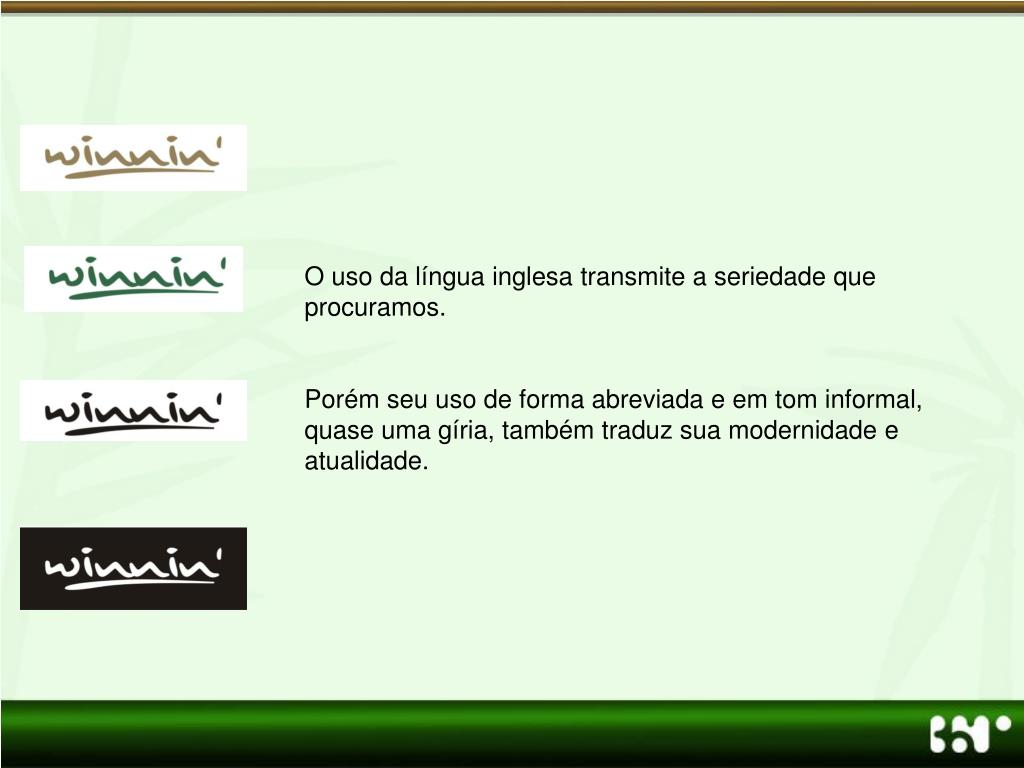 O uso da língua inglesa transmite a seriedade que procuramos. Porém seu uso de forma abreviada e em tom informal, quase uma gíria, também traduz sua modernidade e atualidade.