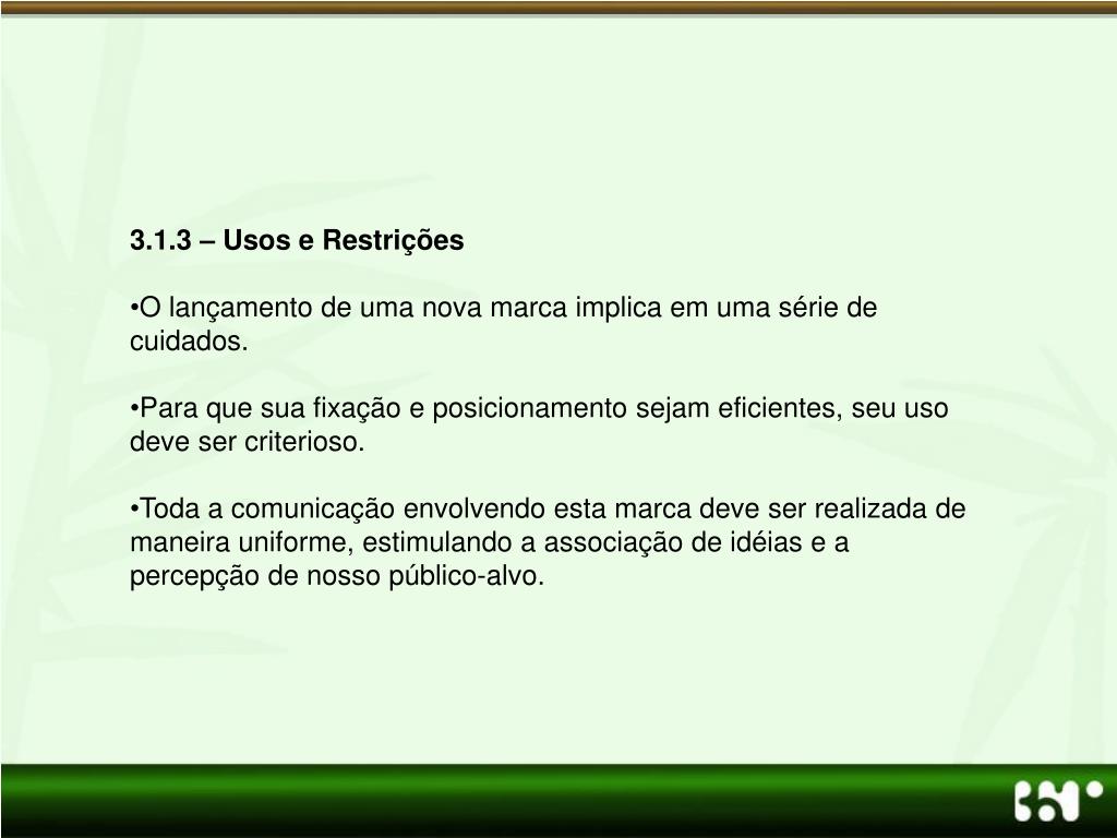 3.1.3 – Usos e Restrições • O lançamento de uma nova marca implica em uma série de cuidados. • Para que sua fixação e posicionamento sejam eficientes, seu uso deve ser criterioso. • Toda a comunicação envolvendo esta marca deve ser realizada de maneira uniforme, estimulando a associação de idéias e a percepção de nosso público-alvo.