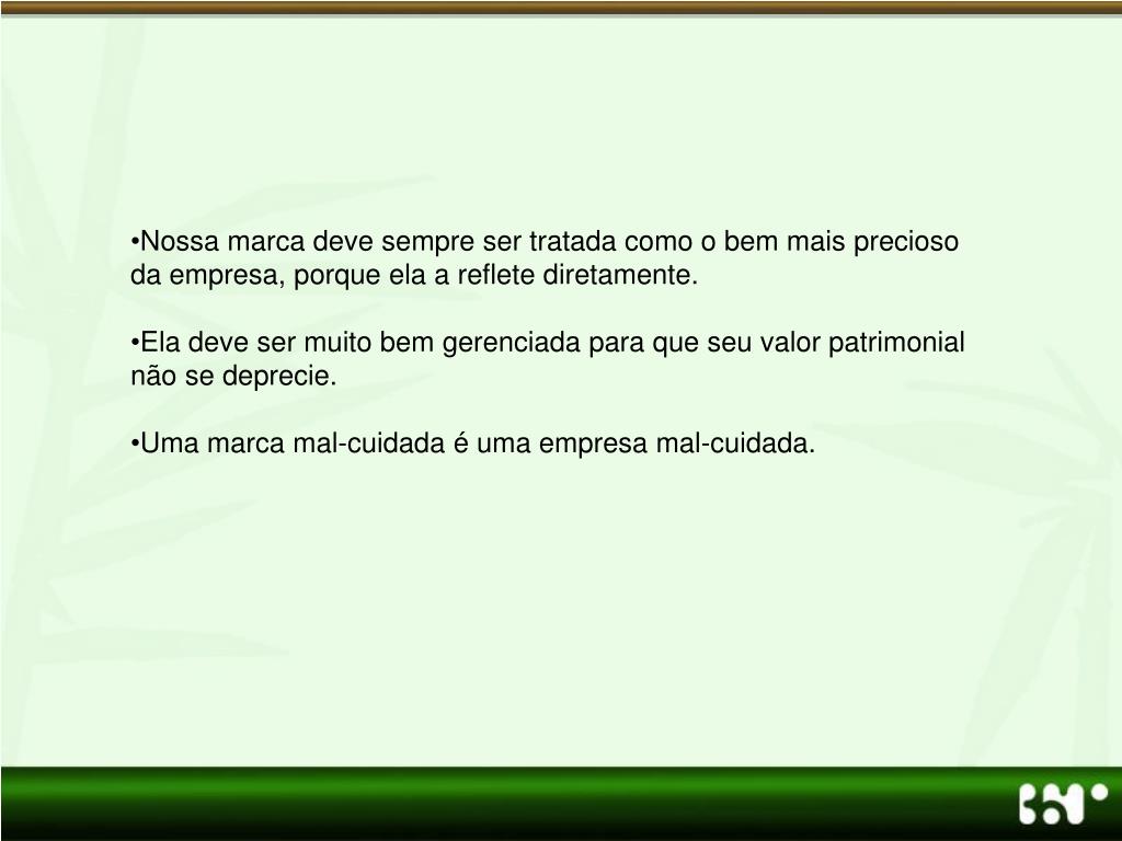 Nossa marca deve sempre ser tratada como o bem mais precioso da empresa, porque ela a reflete diretamente. • Ela deve ser muito bem gerenciada para que seu valor patrimonial não se deprecie. • Uma marca mal-cuidada é uma empresa mal-cuidada.