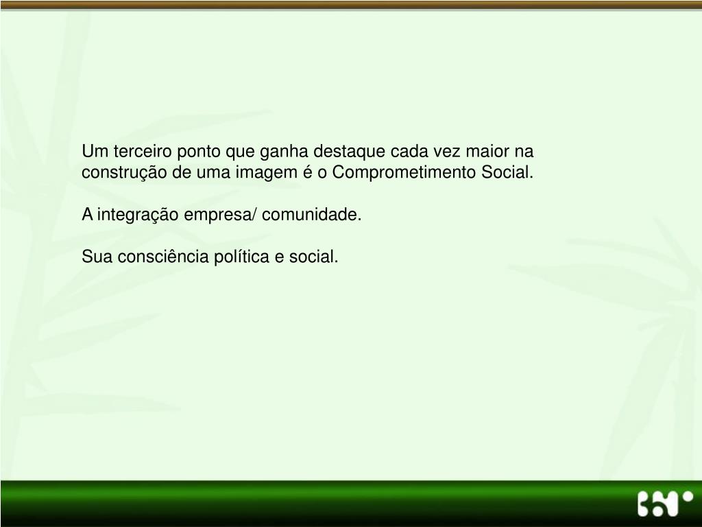 Um terceiro ponto que ganha destaque cada vez maior na construção de uma imagem é o Comprometimento Social. A integração empresa/ comunidade. Sua consciência política e social.
