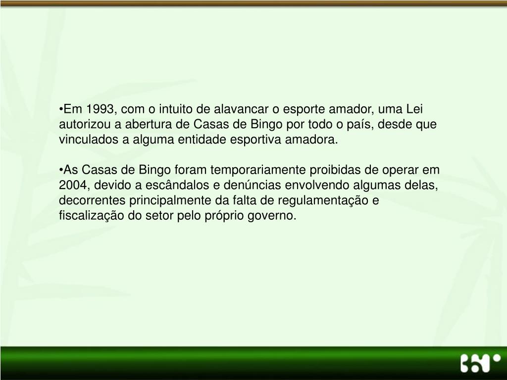 Em 1993, com o intuito de alavancar o esporte amador, uma Lei autorizou a abertura de Casas de Bingo por todo o país, desde que vinculados a alguma entidade esportiva amadora. • As Casas de Bingo foram temporariamente proibidas de operar em 2004, devido a escândalos e denúncias envolvendo algumas delas, decorrentes principalmente da falta de regulamentação e fiscalização do setor pelo próprio governo.