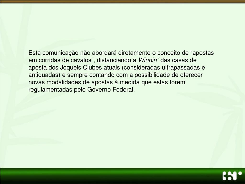 Esta comunicação não abordará diretamente o conceito de “apostas em corridas de cavalos”, distanciando a Winnin´ das casas de aposta dos Jóqueis Clubes atuais (consideradas ultrapassadas e antiquadas) e sempre contando com a possibilidade de oferecer novas modalidades de apostas à medida que estas forem regulamentadas pelo Governo Federal.