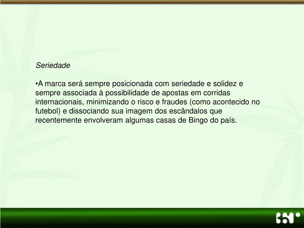 Seriedade • A marca será sempre posicionada com seriedade e solidez e sempre associada à possibilidade de apostas em corridas internacionais, minimizando o risco e fraudes (como acontecido no futebol) e dissociando sua imagem dos escândalos que recentemente envolveram algumas casas de Bingo do país.