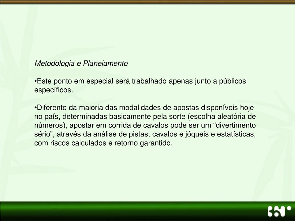 Metodologia e Planejamento • Este ponto em especial será trabalhado apenas junto a públicos específicos. • Diferente da maioria das modalidades de apostas disponíveis hoje no país, determinadas basicamente pela sorte (escolha aleatória de números), apostar em corrida de cavalos pode ser um “divertimento sério”, através da análise de pistas, cavalos e jóqueis e estatísticas, com riscos calculados e retorno garantido.