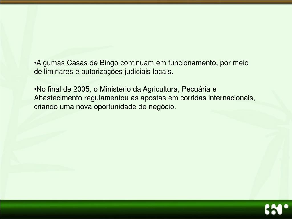 Algumas Casas de Bingo continuam em funcionamento, por meio de liminares e autorizações judiciais locais. • No final de 2005, o Ministério da Agricultura, Pecuária e Abastecimento regulamentou as apostas em corridas internacionais, criando uma nova oportunidade de negócio.
