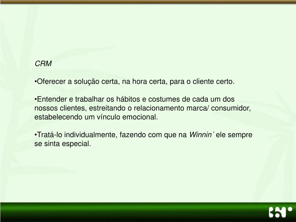 CRM • Oferecer a solução certa, na hora certa, para o cliente certo. • Entender e trabalhar os hábitos e costumes de cada um dos nossos clientes, estreitando o relacionamento marca/ consumidor, estabelecendo um vínculo emocional. • Tratá-lo individualmente, fazendo com que na Winnin´ ele sempre se sinta especial.