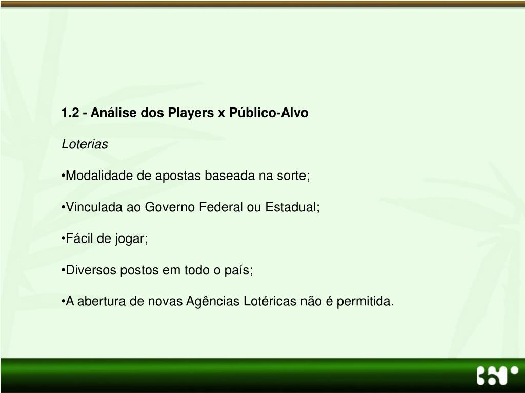 1.2 - Análise dos Players x Público-Alvo • Loterias • Modalidade de apostas baseada na sorte; • Vinculada ao Governo Federal ou Estadual; • Fácil de jogar; • Diversos postos em todo o país; • A abertura de novas Agências Lotéricas não é permitida.