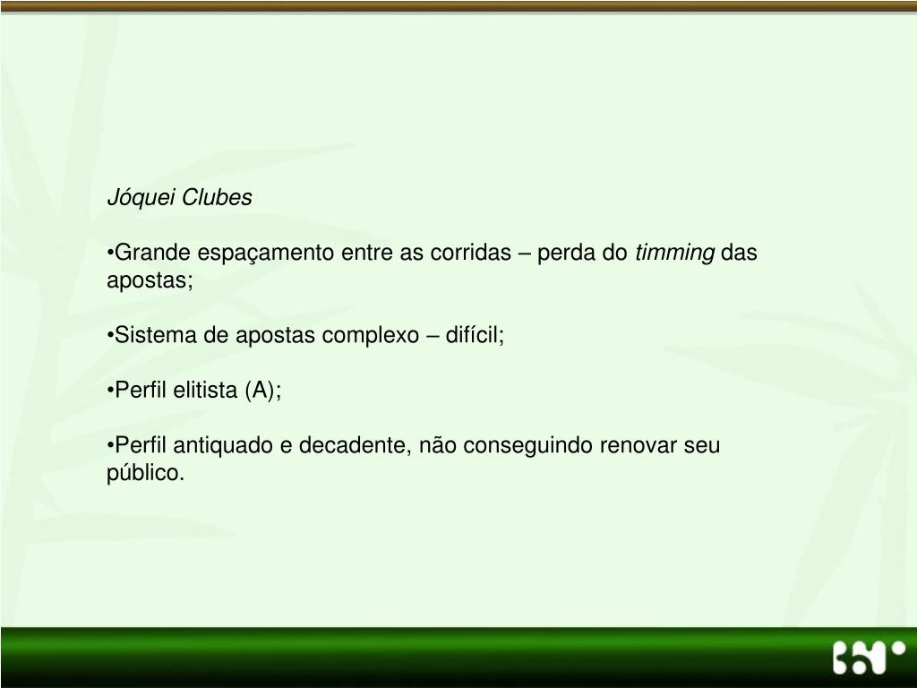 Jóquei Clubes • Grande espaçamento entre as corridas – perda do timming das apostas; • Sistema de apostas complexo – difícil; • Perfil elitista (A); • Perfil antiquado e decadente, não conseguindo renovar seu público.