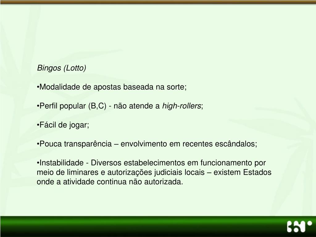 Bingos (Lotto) • Modalidade de apostas baseada na sorte; • Perfil popular (B,C) - não atende a high-rollers; • Fácil de jogar; • Pouca transparência – envolvimento em recentes escândalos; • Instabilidade - Diversos estabelecimentos em funcionamento por meio de liminares e autorizações judiciais locais – existem Estados onde a atividade continua não autorizada.