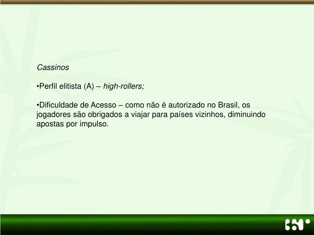 Cassinos • Perfil elitista (A) – high-rollers; • Dificuldade de Acesso – como não é autorizado no Brasil, os jogadores são obrigados a viajar para países vizinhos, diminuindo apostas por impulso.