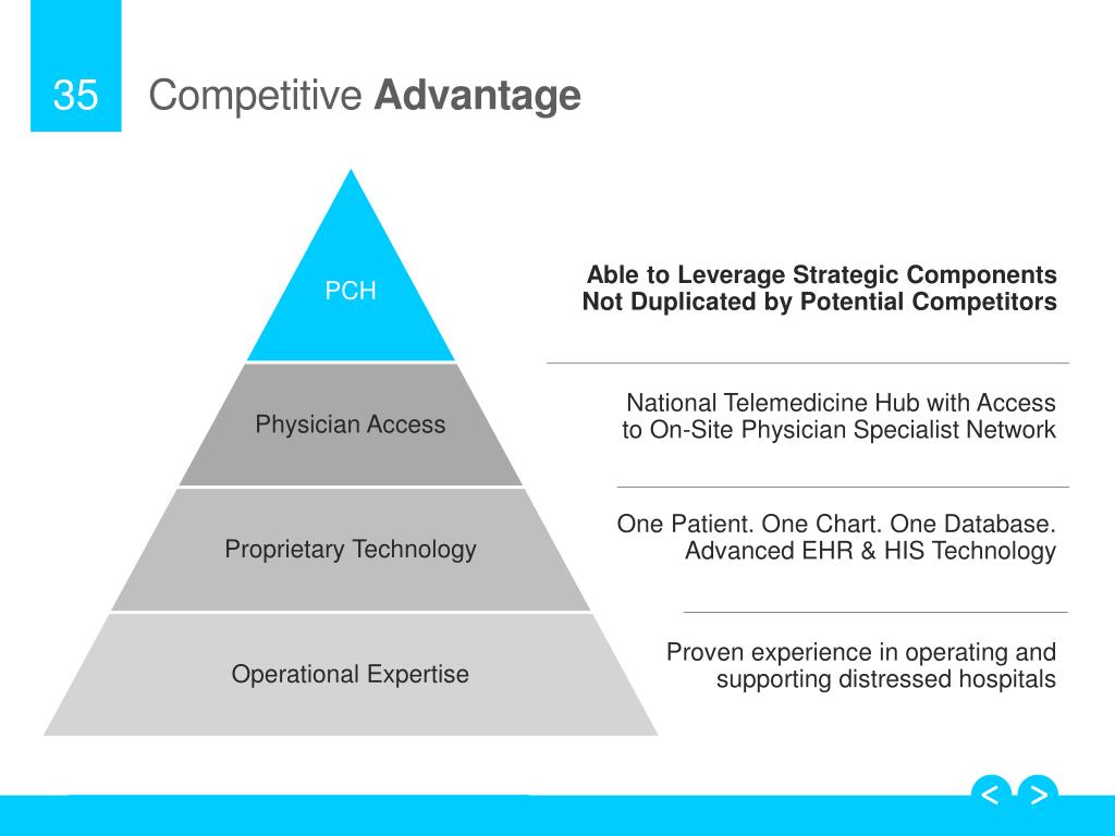 Competitive Advantage Able to Leverage Strategic Components Not Duplicated by Potential Competitors National Telemedicine Hub with Access to On-Site Physician Specialist Network One Patient. One Chart. One Database. Advanced EHR & HIS Technology Proven experience in operating and supporting distressed hospitals