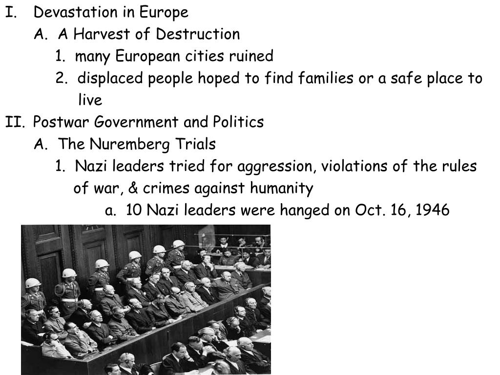 Devastation in Europe A. A Harvest of Destruction 1. many European cities ruined 2. displaced people hoped to find families or a safe place to live Postwar Government and Politics A. The Nuremberg Trials 1. Nazi leaders tried for aggression, violations of the rules of war, & crimes against humanity a. 10 Nazi leaders were hanged on Oct. 16, 1946