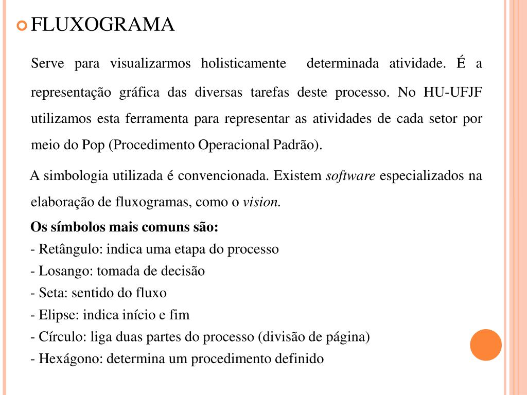 FLUXOGRAMA • Serve para visualizarmos holisticamente determinada atividade. É a representação gráfica das diversas tarefas deste processo. No HU-UFJF utilizamos esta ferramenta para representar as atividades de cada setor por meio do Pop (Procedimento Operacional Padrão). • A simbologia utilizada é convencionada. Existem software especializados na elaboração de fluxogramas, como o vision. • Os símbolos mais comuns são: • - Retângulo: indica uma etapa do processo • - Losango: tomada de decisão • - Seta: sentido do fluxo • - Elipse: indica início e fim • - Círculo: liga duas partes do processo (divisão de página) • - Hexágono: determina um procedimento definido