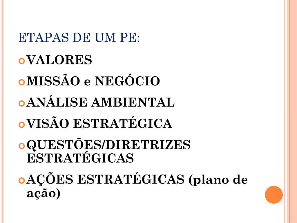 ETAPAS DE UM PE: • VALORES • MISSÃO e NEGÓCIO • ANÁLISE AMBIENTAL • VISÃO ESTRATÉGICA • QUESTÕES/DIRETRIZES ESTRATÉGICAS • AÇÕES ESTRATÉGICAS (plano de ação)