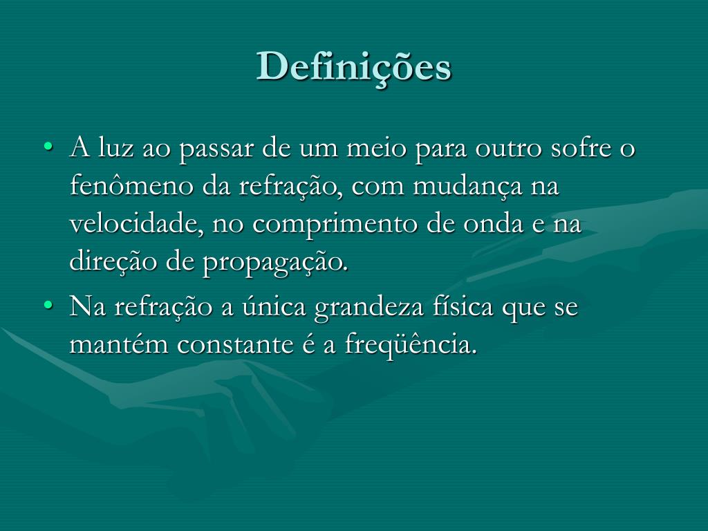 Definições • A luz ao passar de um meio para outro sofre o fenômeno da refração, com mudança na velocidade, no comprimento de onda e na direção de propagação. • Na refração a única grandeza física que se mantém constante é a freqüência.