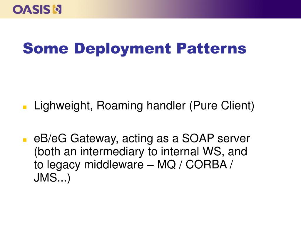 Some Deployment Patterns • Lighweight, Roaming handler (Pure Client) • eB/eG Gateway, acting as a SOAP server (both an intermediary to internal WS, and to legacy middleware – MQ / CORBA / JMS...)