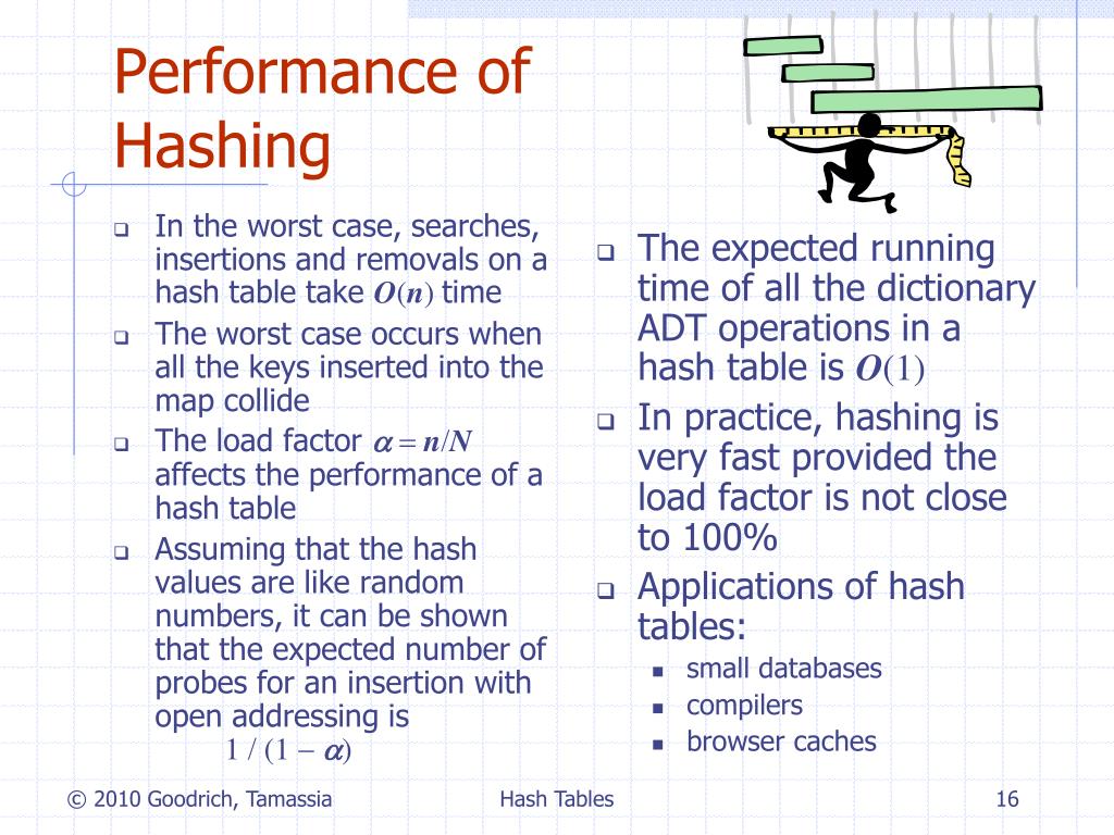 In the worst case, searches, insertions and removals on a hash table take O(n) time The worst case occurs when all the keys inserted into the map collide The load factor a=n/N affects the performance of a hash table Assuming that the hash values are like random numbers, it can be shown that the expected number of probes for an insertion with open addressing is1/ (1 -a) The expected running time of all the dictionary ADT operations in a hash table is O(1) In practice, hashing is very fast provided the load factor is not close to 100% Applications of hash tables: small databases compilers browser caches Performance of Hashing Hash Tables