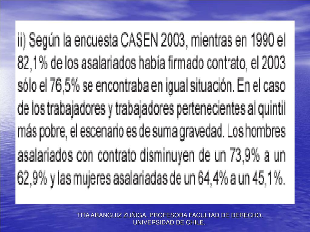 PROHIBICIONES(2/3) Menores 18 años.-. • realizar trabajos con fuerza excesiva (hasta 20 kilos); • realizar trabajos peligrosos para salud, la seguridad y moral del menor; • trabajo nocturno (entre 22.00 y 7.00 hrs.);(excepto trabajos familiares). • Trabajo en cabaret y donde hayan espectáculos en vivo y que vendan alcohol. TITA ARANGUIZ ZUÑIGA. PROFESORA FACULTAD DE DERECHO. UNIVERSIDAD DE CHILE.